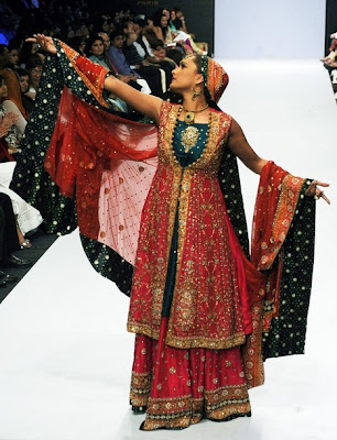 The main outfits I saw was the long kameez styles, with dabka work and diamonte work in intricate detail around necklines and hem. Most of the outfits were less heavier than the ones I'm used to seeing, and there wasn't any bridal samples. I can't find exact pictures of what I viewed but here's some that are pretty close;